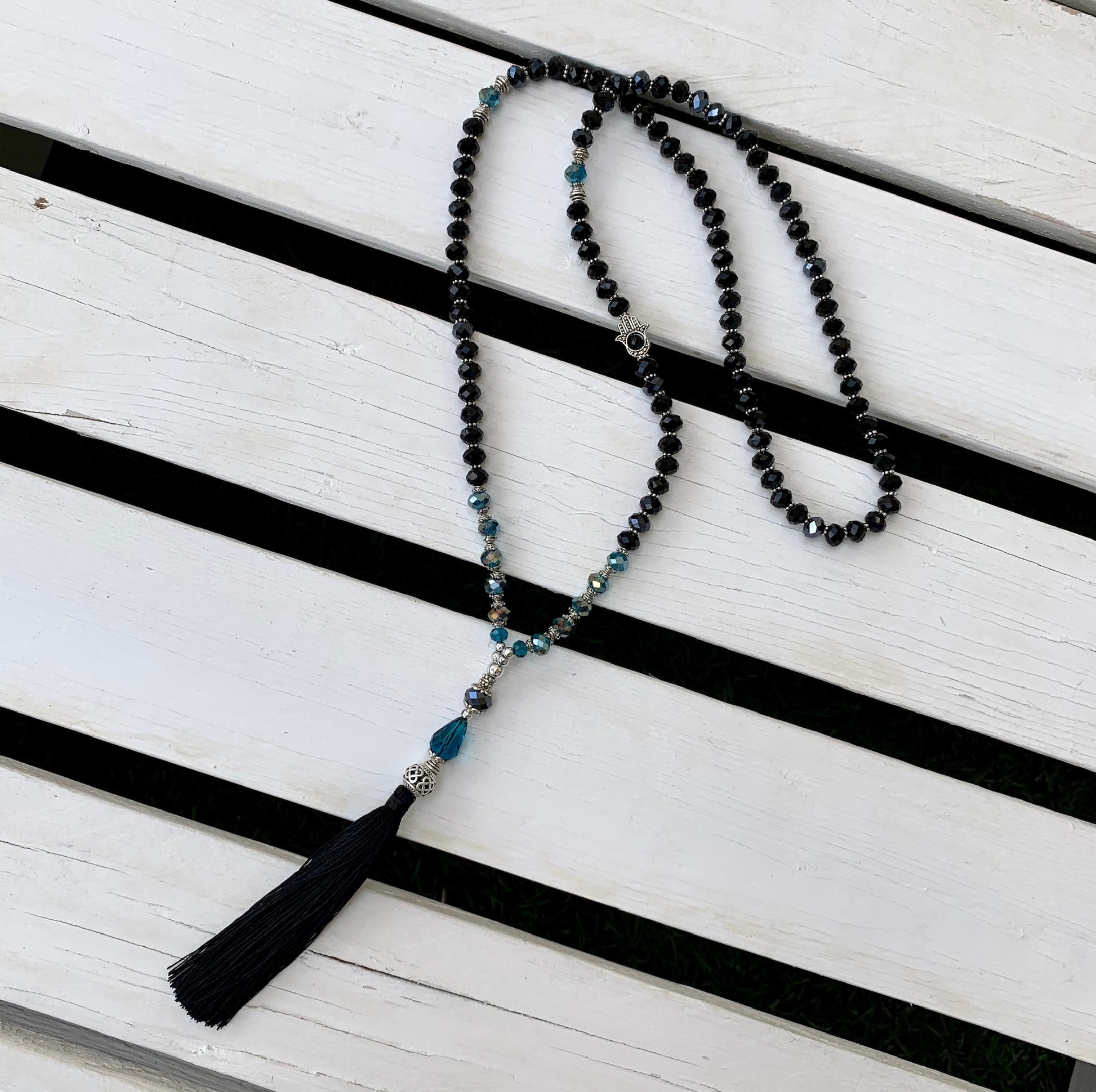 Complete your bohemian look with our Black Crystal Beaded Long Necklace. Featuring 8mm black and teal crystals and a black matching tassel, this necklace adds a touch of sparkle to any outfit.
