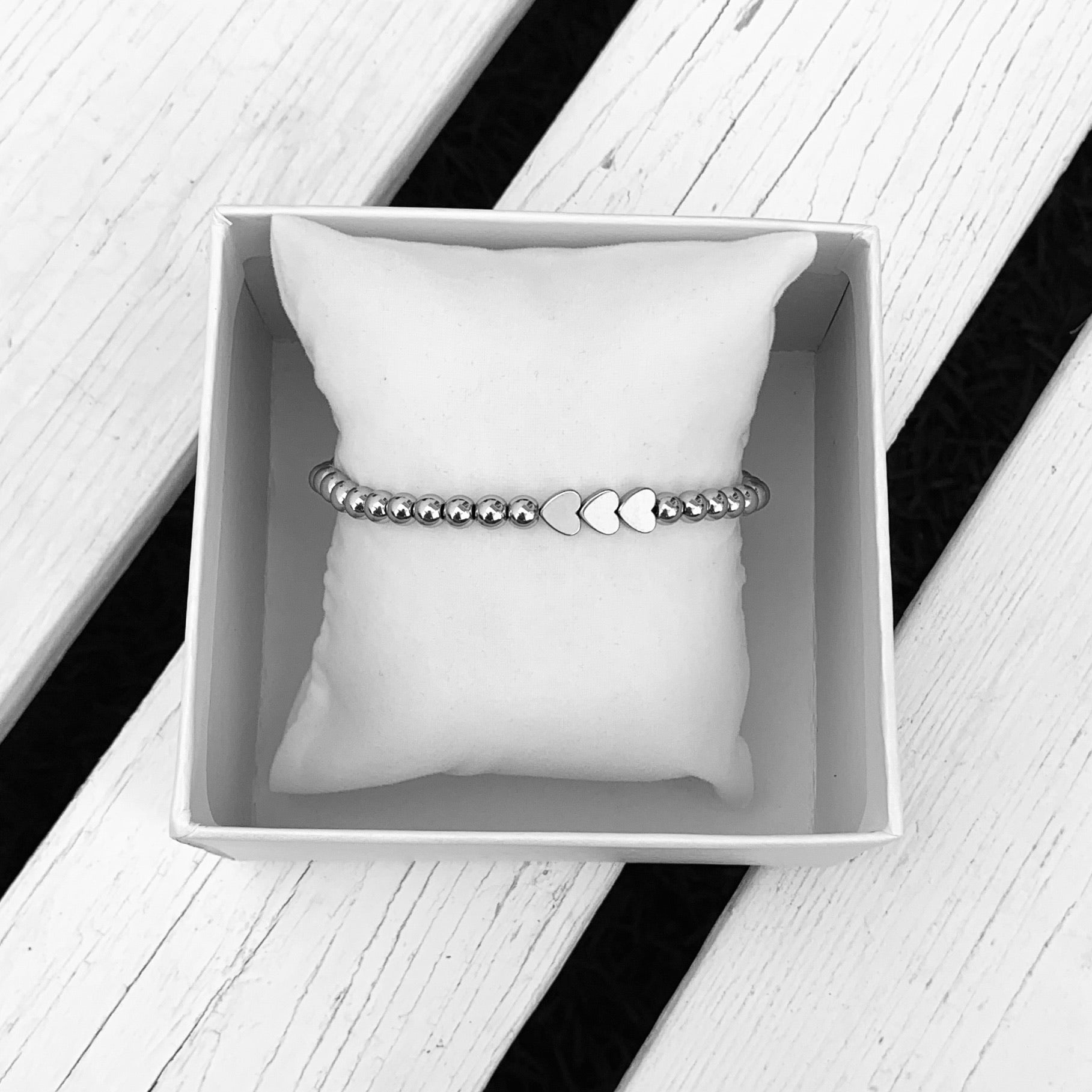 Our handmade 4mm beaded Silver Hematite bracelet with 3 Heart connectors is customisable to make the bracelet unique especially for you or your recipient.