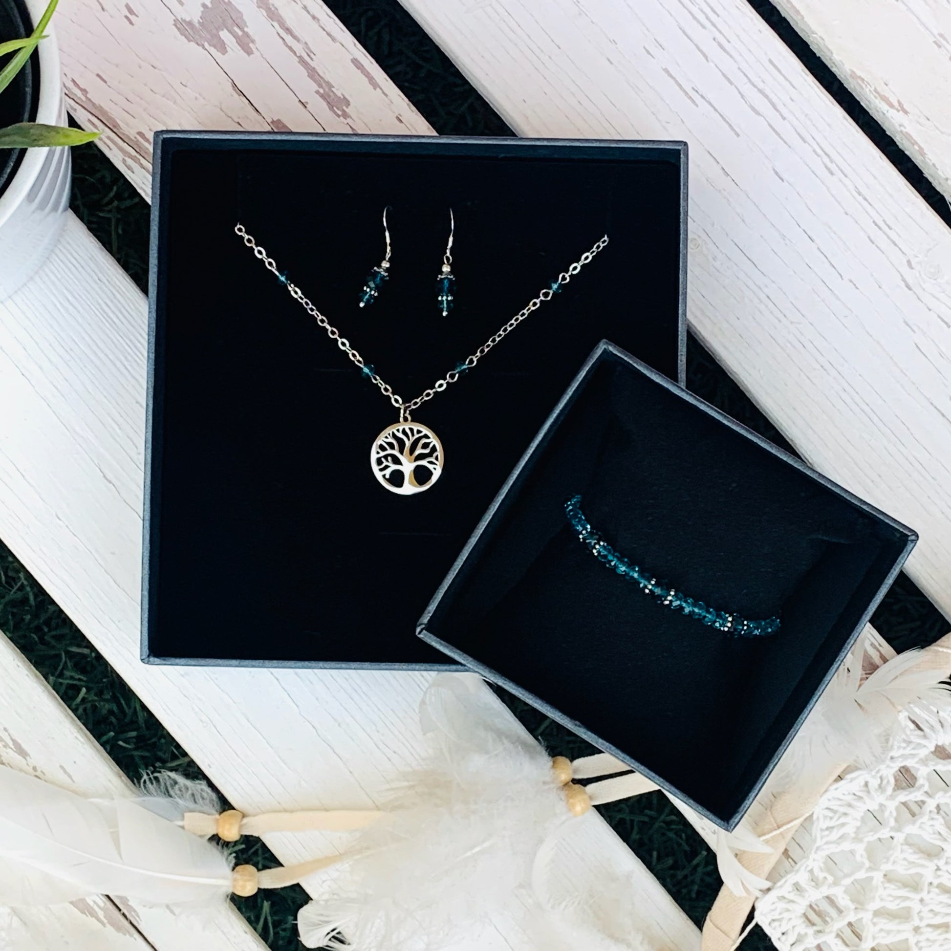 This set can be customised with your choice of bracelet size, crystal colour and small or large necklace pendants from our diverse selection. The necklace/bracelet set can also include matching crystal earrings, the choice is yours to suit you or your recipient.