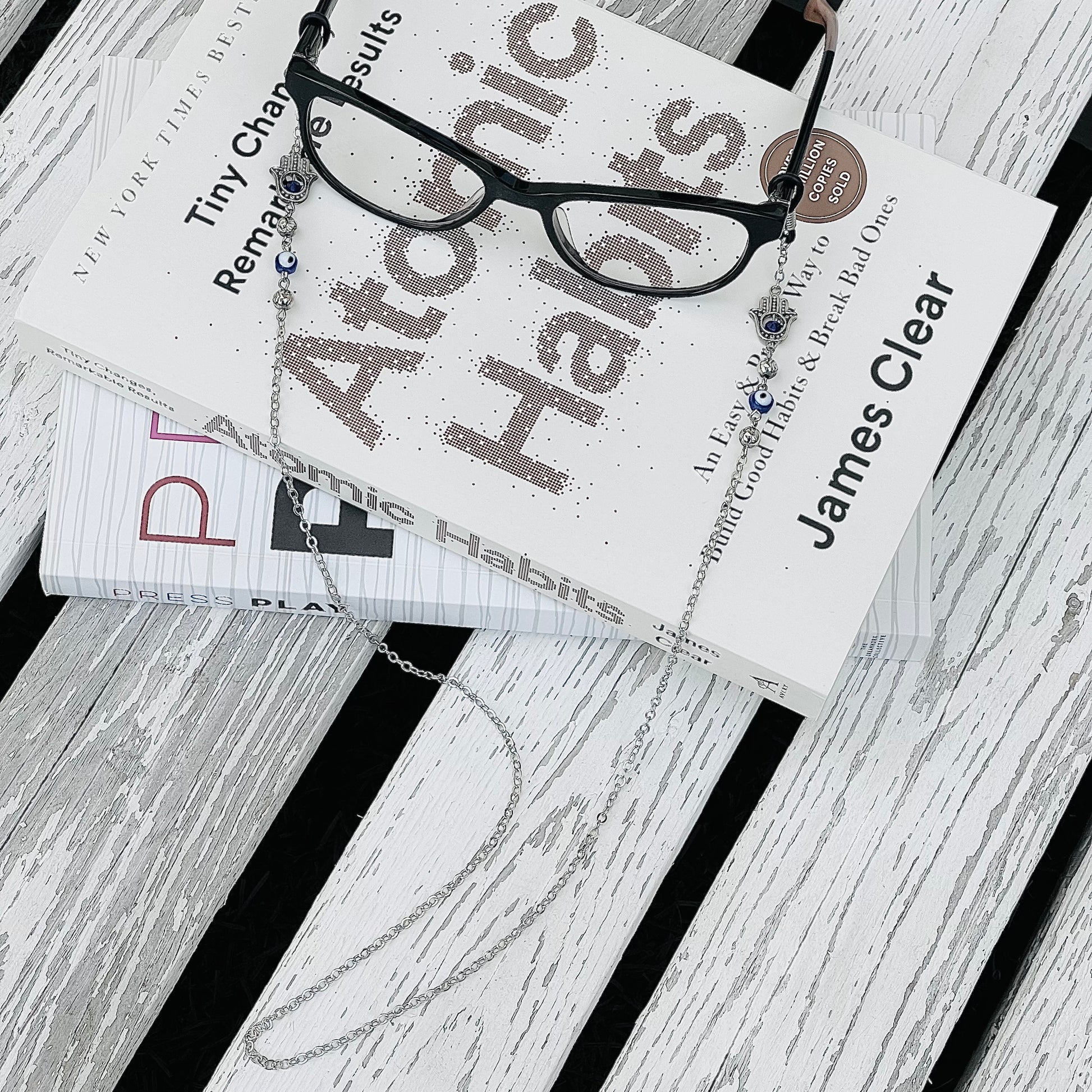 Glasses Chain - Silver Hand of Fatima & Evil Eye Beads with Personalisation option
