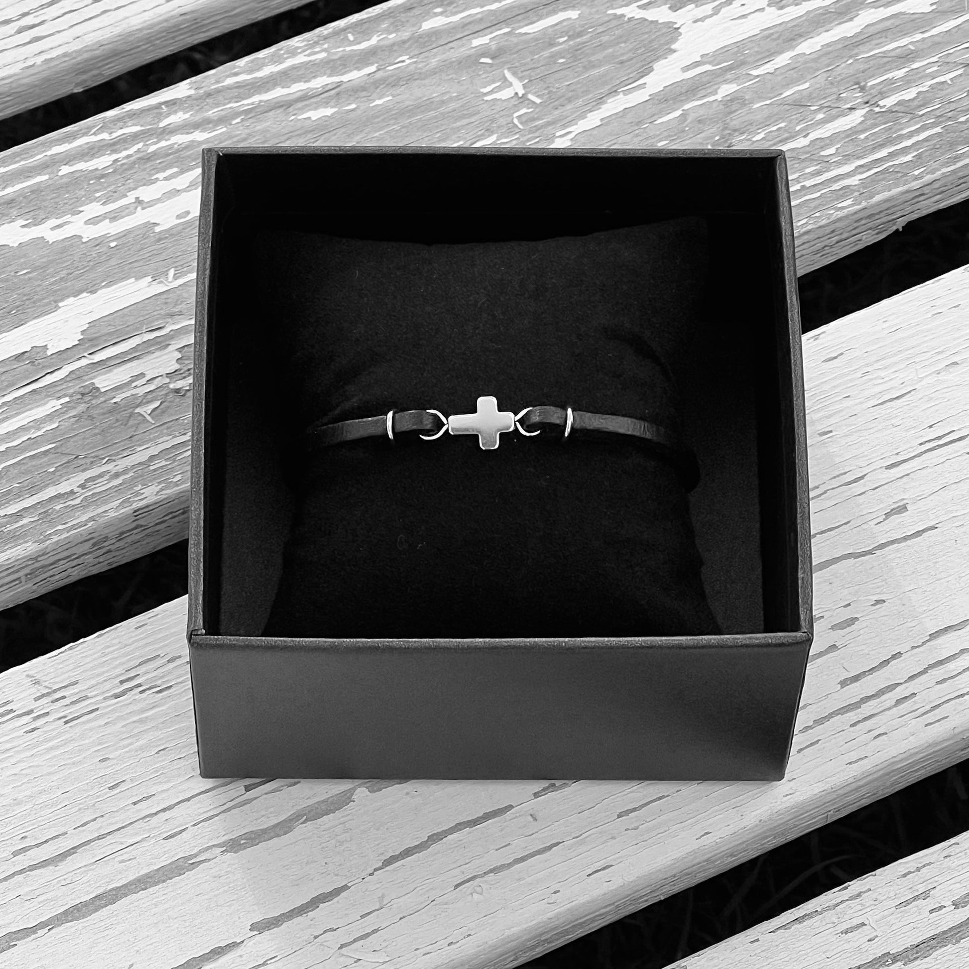 Our handmade unisex black leather bracelet with cross connector can be made for children and adults, female and male.