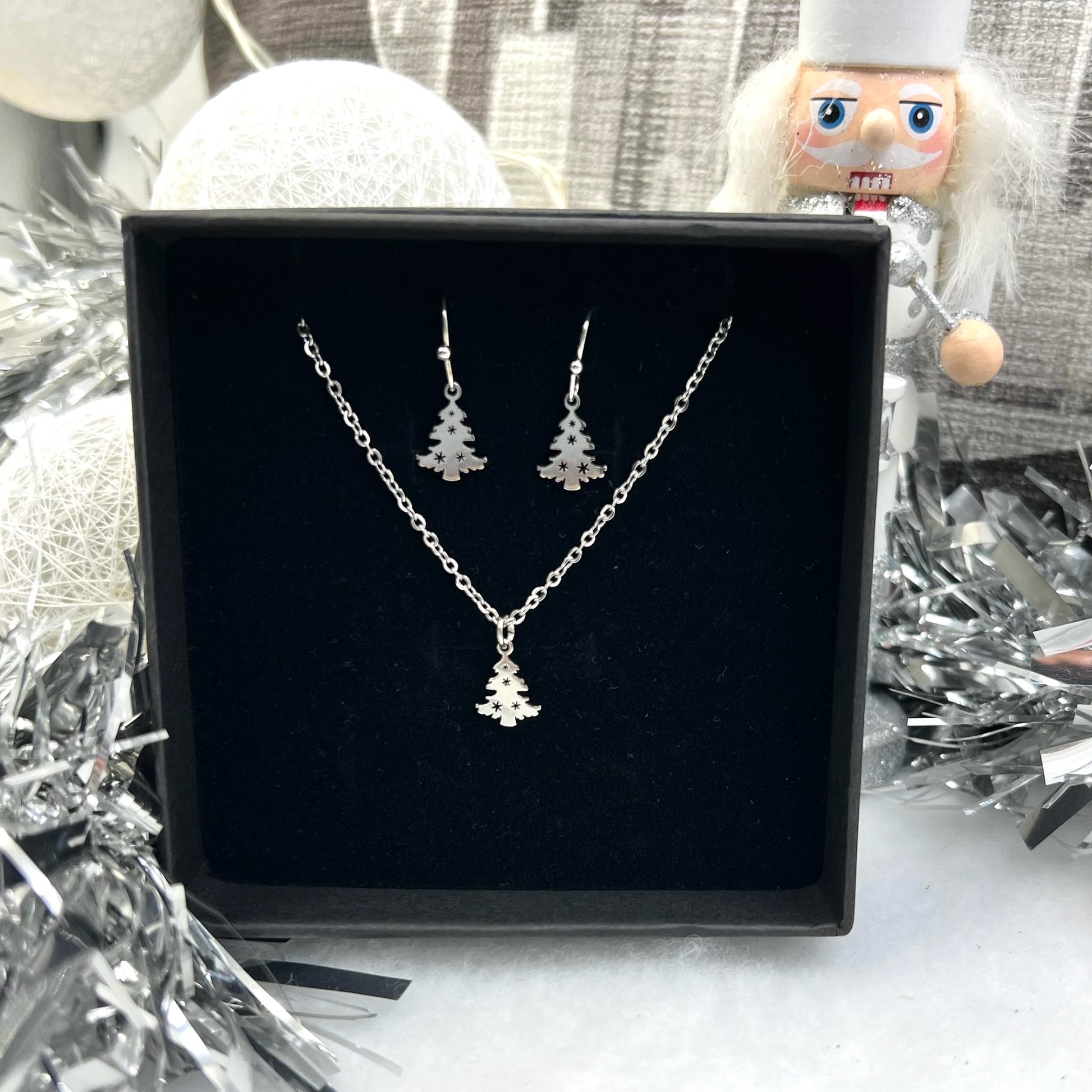 Our gorgeous Silver Christmas Tree necklace is crafted with high quality stainless steel. Order on its own or make it a set with matching earrings.