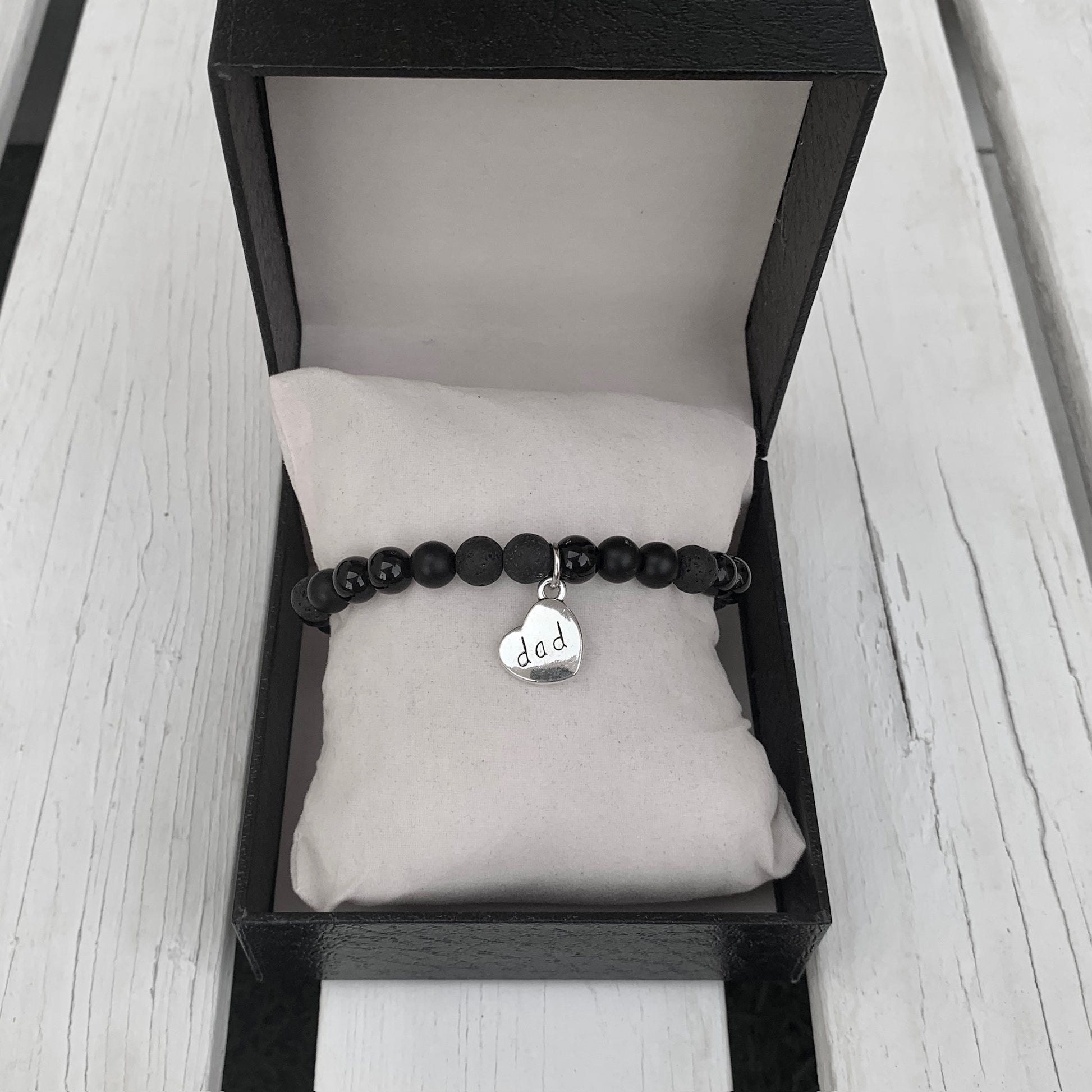 Our handmade 8mm Dad beaded bracelet can be made in a variety of different Gemstone beads/colours to suit his taste and can be ordered in a large range of sizes to fit.